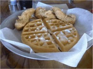 For the very reasonable price of $7.59, one chooses a waffle (buttermilk, banana or cornbread), butter (homemade whipped, honey whipped or Cajun), syrup (maple, clove honey or maple BBQ) and, last but not least, chicken (juicy tenders, crispy wings or two whole pieces…pick from breast, thigh or drum).