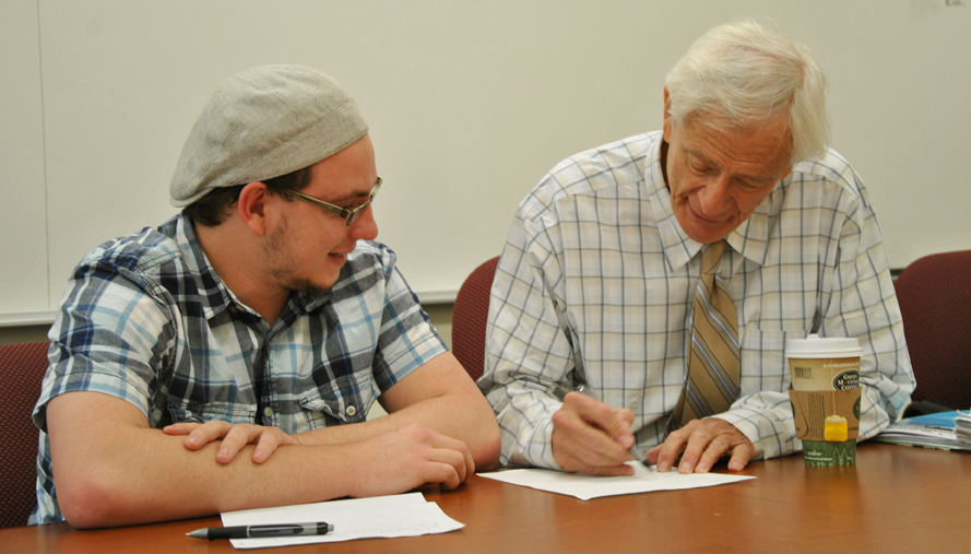Admired for his laid back, non-lecture style, Sandy Kaye, with student Ian Ward, is a popular English professor among undergrads. // PHOTO BY ANDREW BLOM