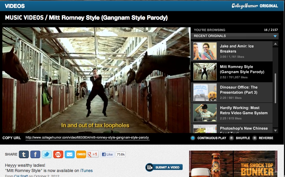 Published October 24, 2012 at 969 × 603 in Politics in “Gangnam Style” Gov. Mitt Romney dances in “Gangam Style” on a parody video. // COLLEGEHUMOR.COM // Share this:Tweet Click to print (Opens in new window) Print Click to email a link to a friend (Opens in new window) Email Post Click to share on Reddit (Opens in new window) Reddit Click to share on Threads (Opens in new window) Threads Click to share on Bluesky (Opens in new window) Bluesky Like Loading... ‹ Return to post Leave a comment Cancel reply Δ