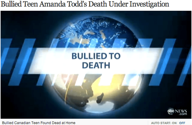 Published November 6, 2012 at 644 × 418 in Beyond Bullying Amanda Todd, a teenager from Canada, committed suicide after being bullied. // PHOTO FROM ABCNEWS.COM Share this:Tweet Click to print (Opens in new window) Print Click to email a link to a friend (Opens in new window) Email Post Click to share on Reddit (Opens in new window) Reddit Click to share on Threads (Opens in new window) Threads Click to share on Bluesky (Opens in new window) Bluesky Like Loading... ‹ Return to post Leave a comment Cancel reply Δ