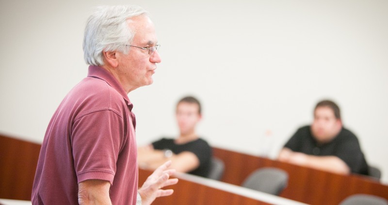 Leading Melanie’s Law advocate Ron Bersani, the driving force behind Melanie’s Law, one of the toughest comprehensive approaches to drunken driving in the nation, speaks to a Politics and History class on Thursday, Oct. 3. // PHOTO BY CONNOR GLEASON / CURRY COLLEGE.