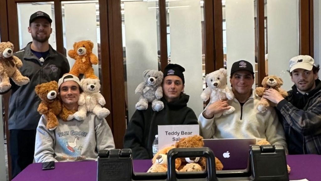 The hockey team is selling bears in the Student Center on campus for students to purchase before the game and there will also be bears available at the game.